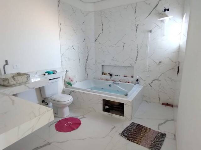 6 quartos, sendo 2 suítes (uma com banheira de hidromassagem) na parte de cima e mais 3 quartos na parte de baixo.